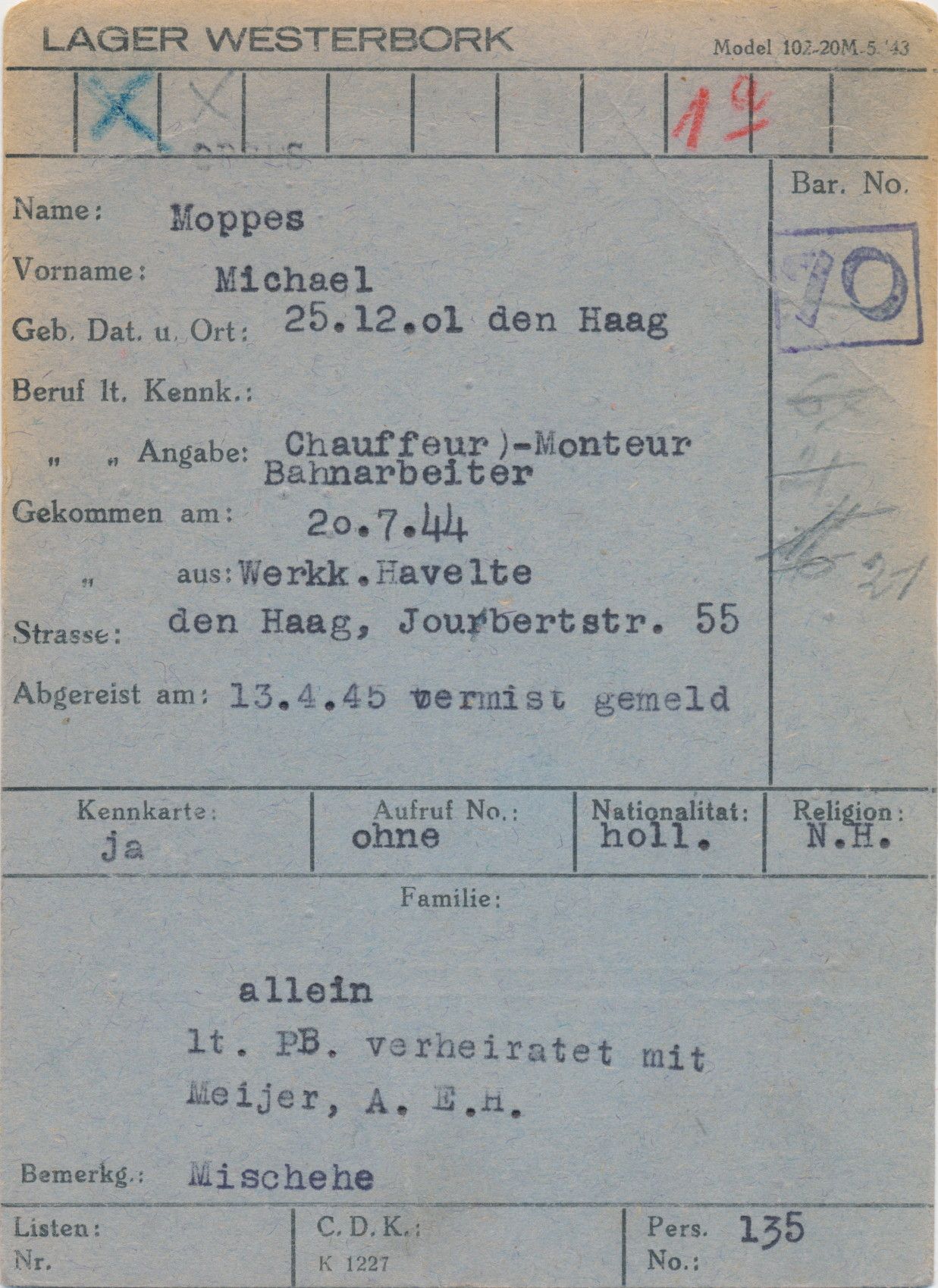 When the Nazis invaded the Netherlands in 1940, the situation got worse and worse for Michel. He then eventually got arrested along with a colleague in July 1944. As a »Mischehefall« (“mixed-marriage case”), he had to spend two days at the police station in Meppel. There, he had to share a cell under inhumane conditions, together with his colleague and another man. They had one cot for all three to sleep on, even though it was designed for one person. After two days on the police station, their further deportation was arranged. They were sent to Assen by train, where an SS-Soldier picked them up at the station. He placed them in a carriage that took them into the Westerbork concentration camp.