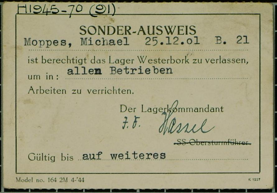 Sonderausweis Michel van Moppes (collection HcKW - https://collecties.kampwesterbork.nl/werk/https%3A%2F%2Fdata.kampwesterbork.nl%2Fwork%2FHCIS.00014567)