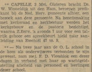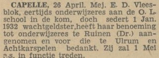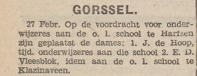 In 1933 werd ze voorgedragen voor een functie op een school in Gorssel, komende van een school in Klazienaveen. Zij kreeg de baan niet.
