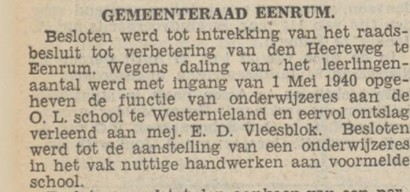 In de krant van 5 december 1940 lezen we dat Elly weer naar Veendam is verhuisd, naar Boven Oosterdiep 37, het adres van haar ouders, komende uit Usquert, dus mogelijk heeft ze daar een aantal maanden gewerkt. Dat ze een goede onderwijzeres was blijkt wel uit de volgende opmerking over Elly: “Ze was dol op kinderen en de kinderen waren dol op haar!”