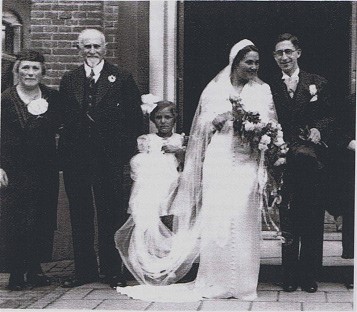 Lex en Aaltje op hun huwelijksdag in 1938 Links haar ouders. Elly zal hier zeker bij zijn geweest.