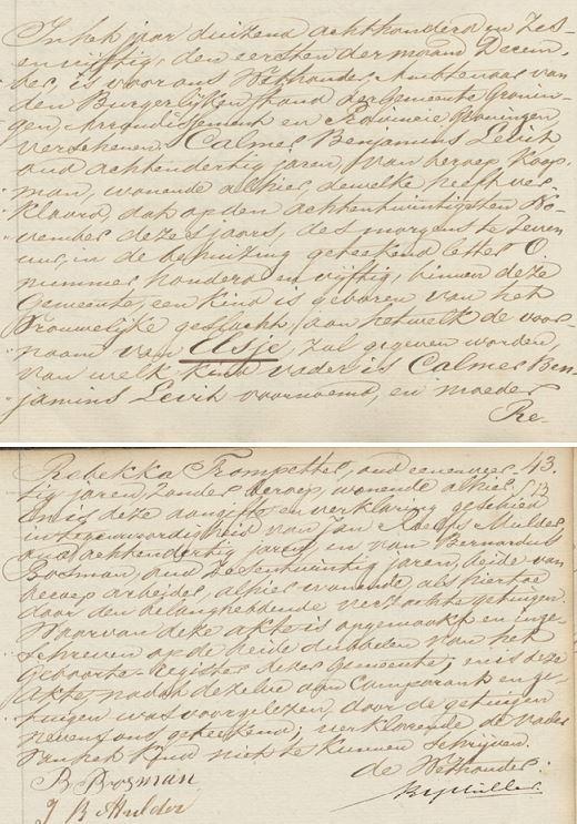 Geboorteakte van Elsje Levit. Zij werd geboren op 28 november 1856 des morgens te zeven uur in de behuizing met adres letter O nummer 150 in de gemeente Groningen. Dat betekent dat het gezin niet in de stad woonde, maar ergens buiten de stadsmuren, in het gebied van de Oosterpoort, of, en dat is gezien het nummer, 150, waarschijnlijker, ergens op een buitenplaats in de richting van Oude Pekela, waar Elsjes vader vandaan kwam. (Allegroningers.nl)
