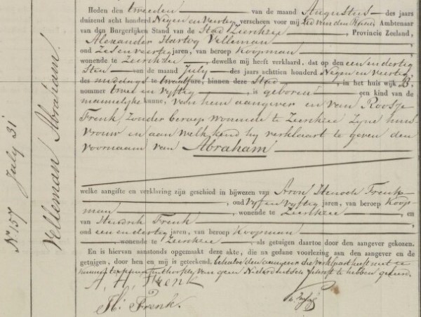 Geboorteakte van Abraham Velleman. De aangever, de vader, kon niet tekenen, ”uit hoofde van geen Nederlandsche schrift te hebben geleerd”. (preserve-zaf.archieven.nl)