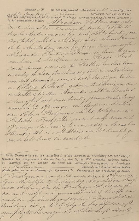 Huwelijksakte van Elsje Levit en Abraham Velleman. Zij trouwden op 28 februari 1878 in Groningen. (allegroningers.nl)