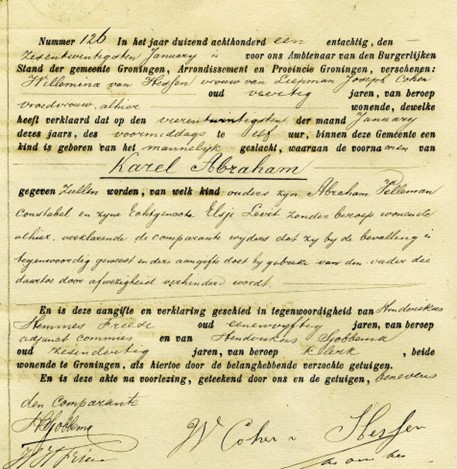 Geboorteakte Karel Abraham Velleman van 26 januari 1881 in Groningen. De vroedvrouw die bij de bevalling aanwezig was deed aangifte “bij gebreke van den vader die daartoe door afwezigheid verhinderd wordt”.(allegroningers.nl)