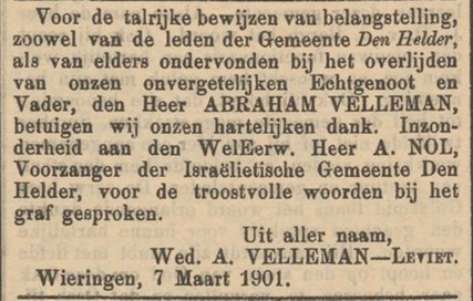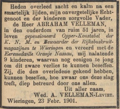 Op 23 februari 1901, drie weken na de geboorte van zijn jongste kind, overleed Abraham Velleman. Elsje plaatste een ontroerende advertentie in de krant. Uit deze advertentie blijkt dat Abraham was gepensioneerd en was onderscheiden met de Eremedaille in de orde van Oranje Nassau. Abraham Velleman werd 51 jaar.