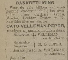 Familiebericht. "Het nieuws van den dag". Amsterdam; Amsterdam, 05-07-1918, p. 8.