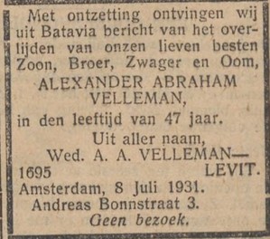 ● Alexander Abraham Velleman (Den Helder 29/8/1883 - NL Indië 8/7/1931) X Gerarda Maria Lancee (Banda Aceh City 8/7/1898 - Amsterdam 21/12/1989)