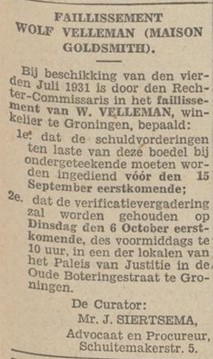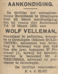 Van Wolf Velleman weten we dat hij in Groningen een zaak had in pelterijen, dus dierenvellen en bont. Zijn zaak heette Maison Goldsmith, naar de achternaam van zijn vrouw. In 1928 vroeg Wolf surseance van betaling aan, en uiteindelijk ging het bedrijf failliet in 1931.