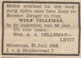 ● Wolf Velleman (Amsterdam 7/6/1890 - Eindhoven 27/6/1938) X Jacoba Goldsmith (Winsum (Friesland) 28/5/1879 - Sobibor 2/7/1943)