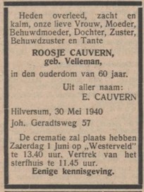 Familiebericht. "De Gooi- en Eemlander : nieuws- en advertentieblad". Hilversum, 31-05-1940, p. 4.