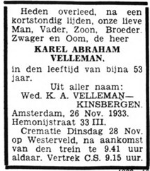 ● Karel Abraham Velleman (Groningen 24/1/1881 - Amsterdam 26/11/1933) X Rebecca Elisabeth Kinsbergen (Amsterdam 9/5/1885 - Bussum 18/2/1954)