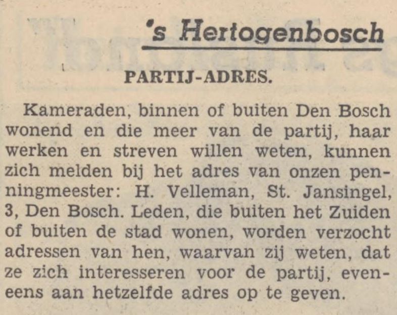 Hartog Velleman uit ’s Hertogenbosch was als Jood lid van de Communistische Partij Nederland (CPN). Door zijn gemengde huwelijk was hij vrijgesteld van deportatie en werd hij voorlopig met rust gelaten. Vanwege zijn lidmaatschap van de CPN liep hij wel gevaar. In 1943 werd hij door de Duitsers opgepakt en doorgestuurd. Na een gang langs meerdere kampen stierf hij in maart 1945 door uitputting in een kamp in Langenstein.
