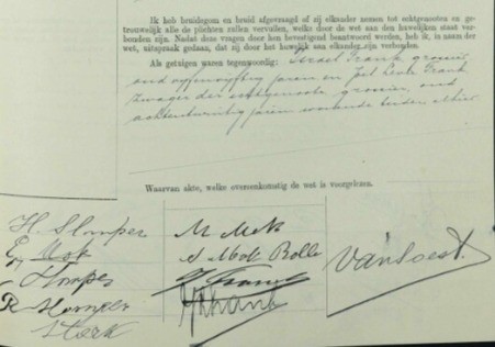 Stadsarchief Amsterdam. Handtekeningen bruidspaar, hun beider ouders en twee getuigen,