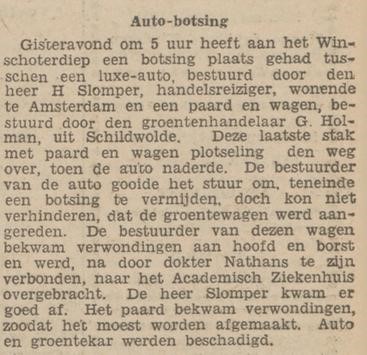 Herman was handelsreiziger. Het is bijzonder dat hij al in de vroege jaren ’30 de beschikking had over een auto. Dat hij met die auto een plotseling overstekend paard met groentenkar aanreed haalde de krant.