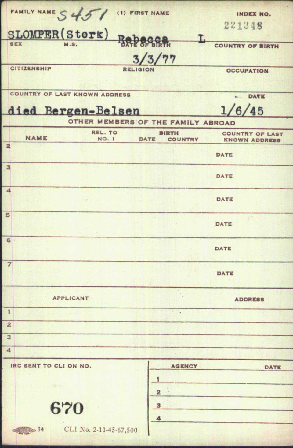 Hermans moeder Rebecca Slomper – Stork overleefde het kamp niet. Zij stierf in Bergen Belsen op 6 januari 1945. Ze werd 67 jaar.