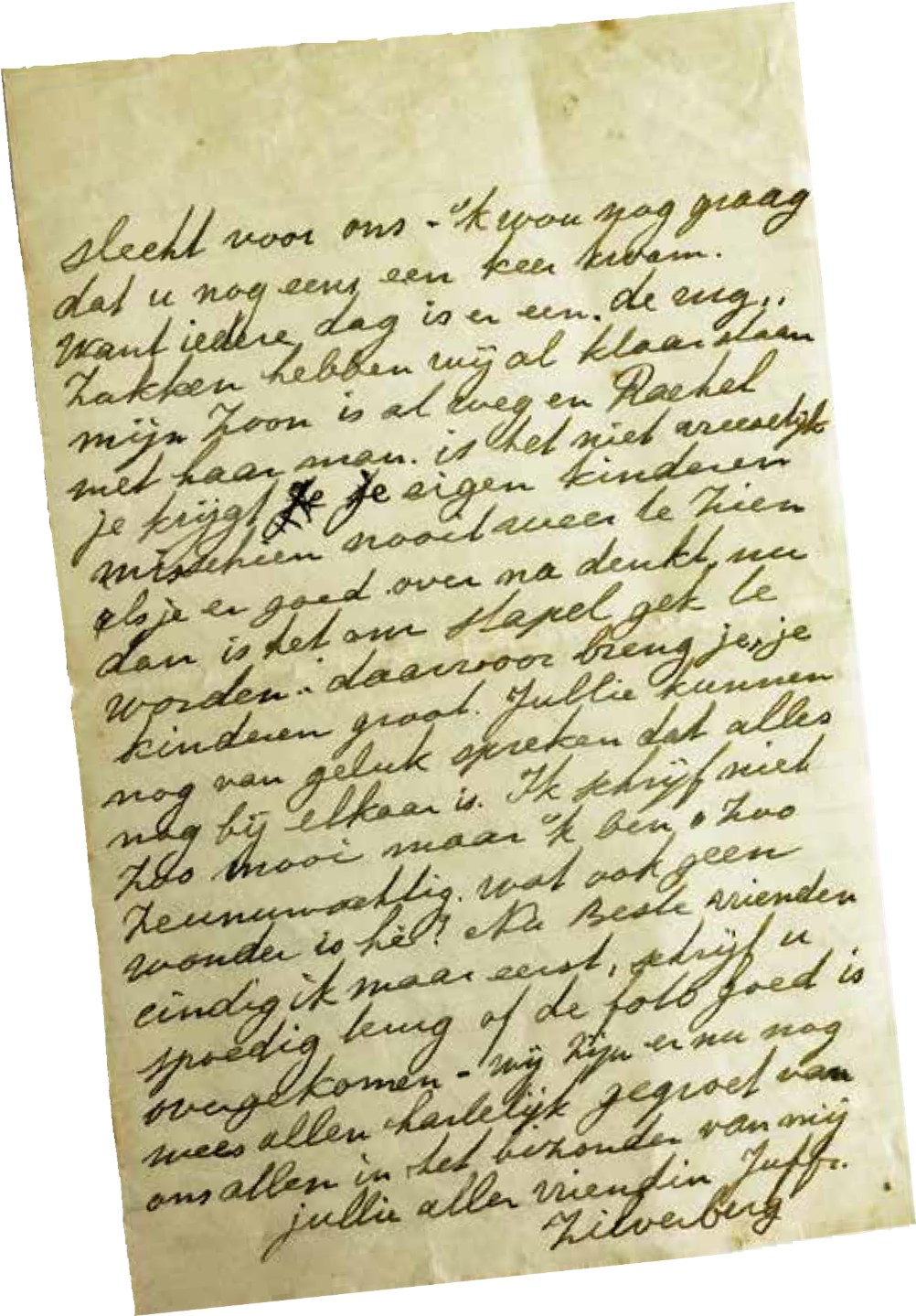 ´Want o beste menschen het staat er zoo slecht voor ons. Ik wou nog graag dat u nog eens een keer kwam. Want iedere dag is er een. De rugzakken hebben wij al klaar staan. Mijn zoon is al weg en Rachel met haar man. Is het niet vreeselijk je krijgt je eigen kinderen misschien nooit weer te zien. Als je er goed over nadenkt is het om stapelgek van te worden. Daarvoor breng je je kinderen groot. Jullie kunnen nog van geluk spreken dat alles nog bij elkaar is. Ik schrijf niet zoo mooi maar ik ben zoo zenuwachtig wat ook geen wonder is hè?´