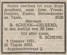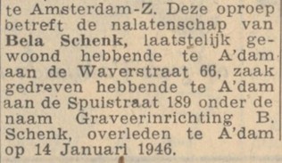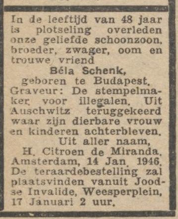 Op 14 januari 1946 overleed hij plotseling. Onderstaande advertentie, geplaatst door zijn schoonmoeder, die ook uit de kampen was teruggekeerd, doet vermoeden dat hij verzetsmensen heeft geholpen door stempels te maken, en vertelt bovendien in een paar woorden iets van het onvoorstelbare leed van vlak na de oorlog. Béla Schenk werd 48 jaar.