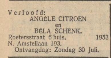 Béla woonde toen in de Nieuwe Amstellaan, en Angèle woonde bij haar ouders in de Roetersstraat. Daar had haar vader in 1926 een winkel geopend.