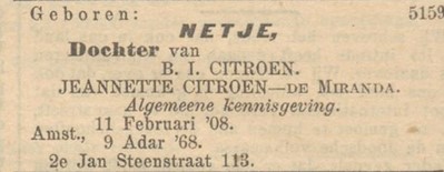 Ze woonden ook nog in de 2e Jan Steenstraat, in de St. WIllibrordusstraat, de ‘s-Gravesandestraat en de Roetersstraat. Uiteindelijk woonden ze in de Holendrechtstraat 45 huis. De jongste dochter, Netje, Nettie genoemd, werd in Amsterdam geboren op 11 februari 1908. (*1 voor zusjes van Angèle)