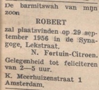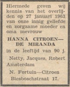 ● Netje (Nettie) Citroen (Amsterdam 11/2/1908 - ?) X Jacob Fortuin (Amsterdam 17/6/1903 - Dachau 4/1/1945) Op 16/10/1943 was hun zoon geboren in Amsterdam. Hij werd naar Friesland gebracht en in een gezin geplaatst, waardoor hij de oorlog overleefde. Zijn ouders werden met het transport van 5 april 1944 naar Theresienstadt gedeporteerd. Dit was een trein met vijf verschillende bestemmingen. 240 Joden in goederenwagons naar Auschwitz, 101 Joden in twee passagierswagons naar Bergen-Belsen, 289 Joden in twee wagons naar Theresienstadt, onder wie dus Jacob Fortuin, die klokkenmaker was, en Nettie Fortuin Citroen. Daarnaast 41 vrouwen en kinderen naar Ravensbrück (een wagon), en 28 mannen naar Buchenwald (een wagon), voornamelijk Roemeense Joden. In Assen werden goederenwagons gekoppeld met 625 Joden vanuit België met bestemming Auschwitz. Jacob Fortuin werd van Theresienstadt weggevoerd en vermoord in Dachau op 4 januari 1945. Nettie overleefde Theresienstadt en keerde samen met haar moeder terug naar Nederland. Op 21 augustus 1945 werden zij geregistreerd in de Joodse Invalide, Weesperplein 1 in Amsterdam. Na enige tijd werd zij met haar kind herenigd.