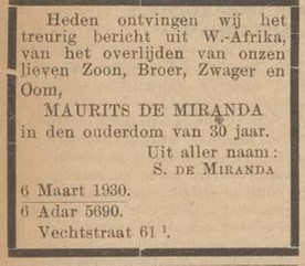Familiebericht. "Centraal blad voor Israëlieten in Nederland". Amsterdam, 16-05-1930, p. 8. Geraadpleegd op Delpher op 30-07-2025, https://resolver.kb.nl/resolve?urn=MMKB19:000578072:mpeg21:p00008