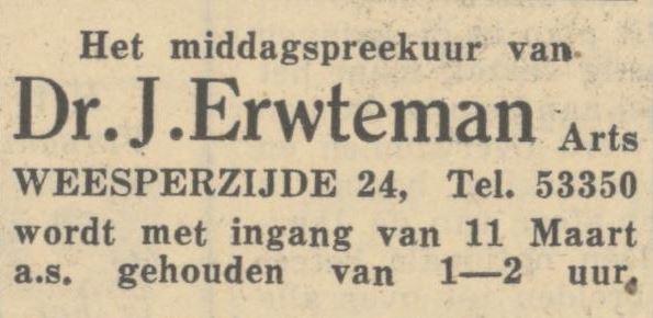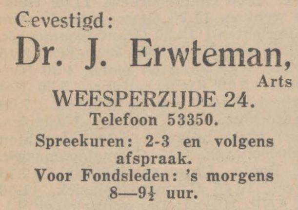 Dr. Erwteman werd op 16 februari 1943 op transport gesteld en verloor het leven in Auschwitz op 1 september 1943. Zijn vrouw Jetty en dochter overleefden de oorlog.