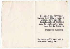 De familie Van der Lijn vertrok op 19 februari 1943, 5 weken na de geboorte van hun derde kind Felicie, naar de Pres. Brandtstraat 3III in Amsterdam.
