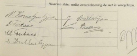 Handtekeningen onder de huwelijksakte: het bruidspaar, Eva’s ouders en de getuigen Joseph Brilleslijper, broer van Eva’s moeder, 58 jaar koopman, en Levie Bolle, de man van Nathans zuster Klaartje, colporteur, 49 jaar. Allen wonende in Amsterdam. (gemeentearchief amsterdam)