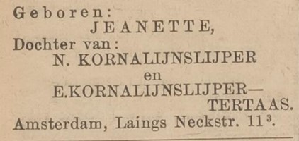 Daar woonden Nathan en Eva na hun huwelijk ook, in hetzelfde huis als Eva’s ouders. Dat blijkt uit de geboorteaankondiging van hun dochter, Jeanette. Zij werd geboren op 7 juni 1937, een paar maanden na het huwelijk.