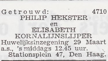 ● Elisabeth Kornalijnslijper (Amsterdam 31/8/1917 - Auschwitz 19/11/1942) X Philip Hekster (Den Haag 19/1/1919 - Midden Europa 31/3/1944)