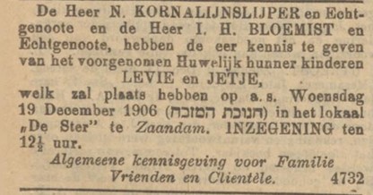 Familiebericht. "Nieuw Israelietisch weekblad". Amsterdam, 14-12-1906, p. 6. Geraadpleegd op Delpher op 16-09-2025, https://resolver.kb.nl/resolve?urn=ddd:010871764:mpeg21:p006