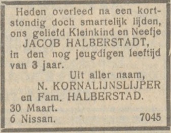 Familiebericht. "Nieuw Israelietisch weekblad". Amsterdam, 03-04-1925, p. 6. Geraadpleegd op Delpher op 16-09-2025, https://resolver.kb.nl/resolve?urn=ddd:010872534:mpeg21:p006