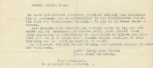 Door het huwelijk met de 30 jaar oudere Moses kwam Betty net als haar nieuwe echtgenoot op de lijst van ‘Alte Lagerinsassen’ die een voorlopige vrijstelling van transport hadden. Mozes en Betty verbleven in barak 49. Op zijn kaart uit de cartotheek van de Joodse Raad staat dat Moses een ‘Albersheimverklaring’ had gekregen: een medische verklaring, op grond waarvan men kon aantonen lichamelijk geschikt te zijn voor pionierswerk in Palestina en dus in aanmerking kwam voor uitwisseling.