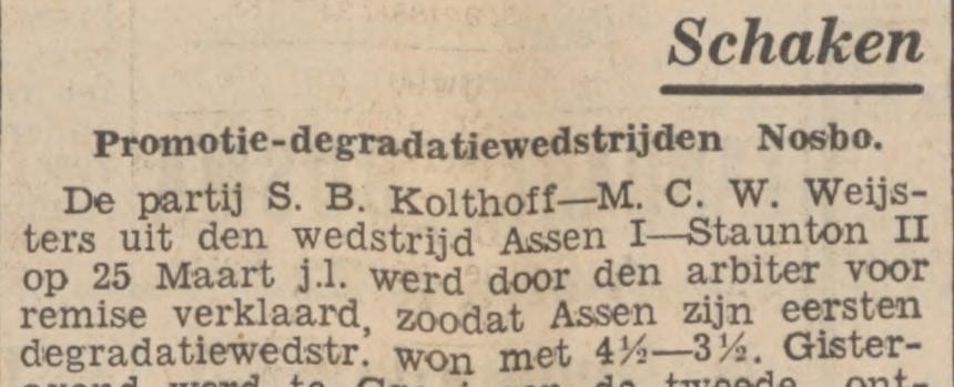 SPORT Schaken Promotie-degradatiewedstrijden Nosbo.. "Nieuwsblad van het Noorden". Groningen, 22-04-1936, p. 3. Geraadpleegd op Delpher op 10-07-2025, https://resolver.kb.nl/resolve?urn=ddd:010673169:mpeg21:p003